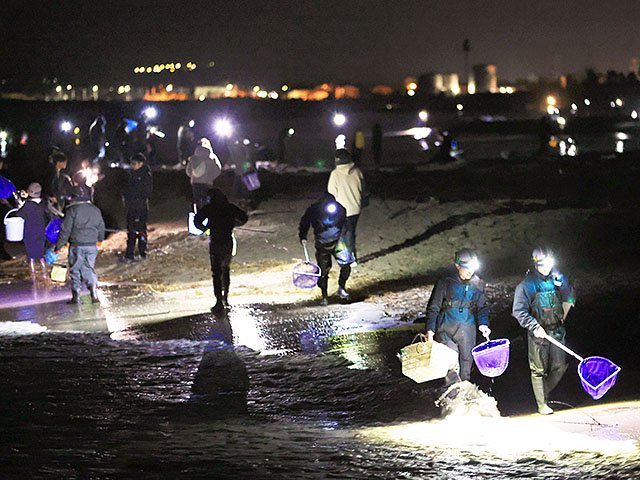 3~5月はホタルイカが産卵のために海岸に集まり、波打ち際で「身投げ」が見られる。この日は発生しやすいとされる新月で、富山市の八重津浜は多くの人でにぎわい、ヘッドライトで海を照らし、網を手に探していた。