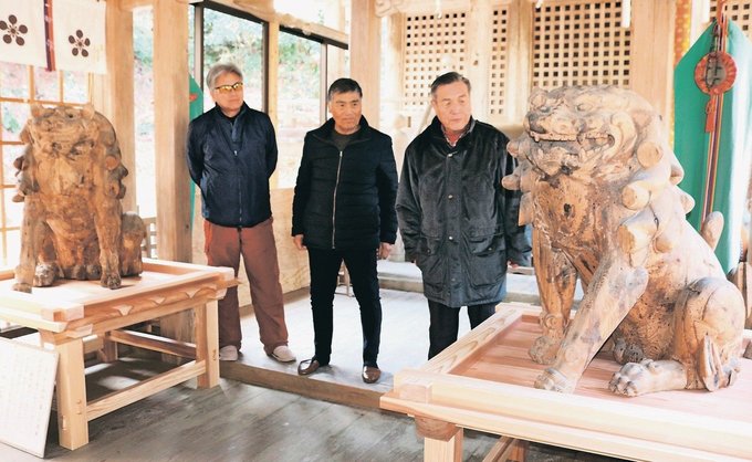 30日は奉賛会員15人がこま犬を拝殿に運び、スギ材の台に設置した。北野会長は「せっかくの文化財なので多くの人に見てほしい」と話した。