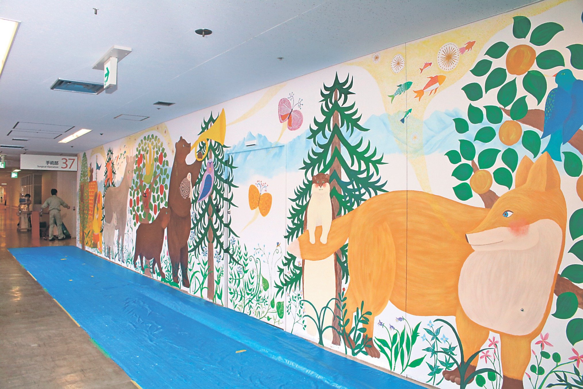 富山大付属病院(富山市杉谷、林篤志院長)がクラウドファンディング(CF)を活用して院内で整備を進めていた「ホスピタルアート」が完成した。患者の不安や緊張を和らげるのが目的で、3階の手術室の入り口に続く廊下の壁一面に富山の自然が優しい色合いで描かれている。完成式が31日あり、関係者が祝った。(新井翔大)