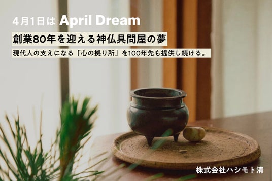 1945年 富山県高岡市にて創業し、人々に心の拠り所となる商品や場を提供してきた神仏具問屋 株式会社ハシモト清(本社:富山県高岡市あわら町、代表取締役:橋本卓尚)は、4月1日を夢を発信する日にしようとするプロジェクト「April Dream」に賛同します。このプレスリリースは株式会社ハシモト清の夢であり、実現を本気で目指しています。