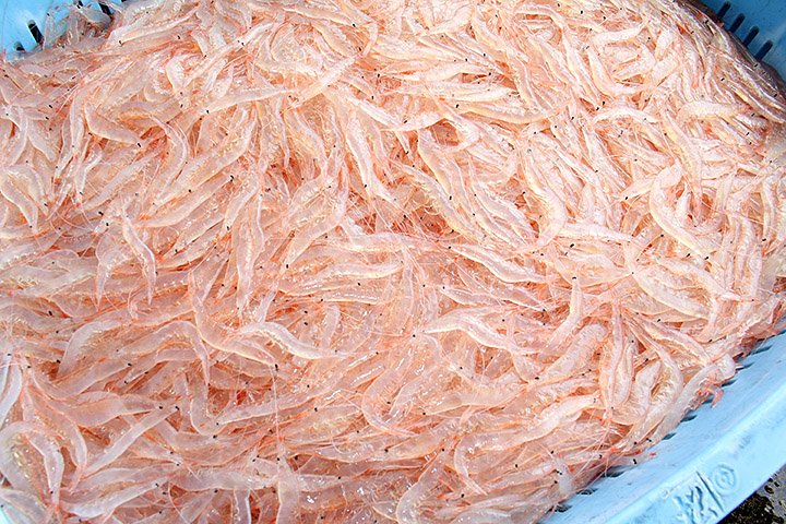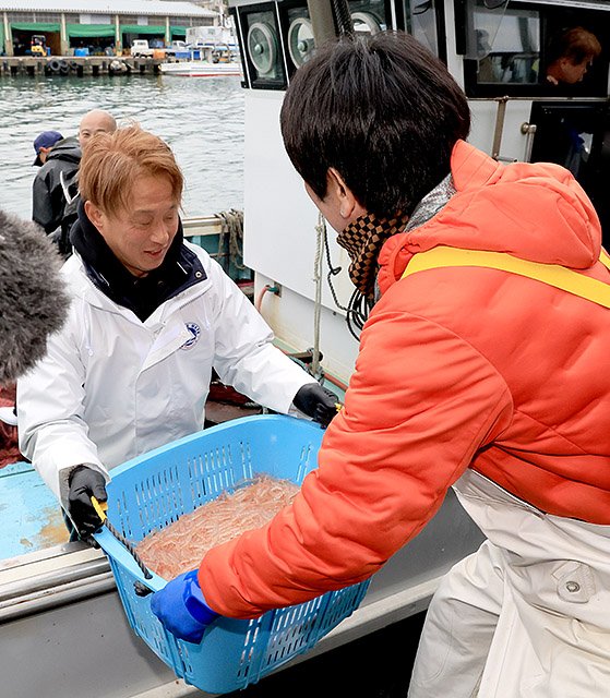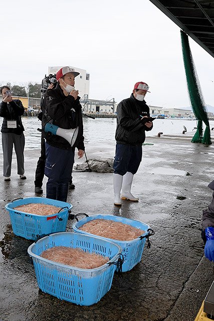 漁師たちは小型底引き網漁船4隻に乗り、午前4時半ごろに漁港を出た。沖合2~3キロ、水深300~350メートルの漁場で操業。続々と港に戻り、シロエビが入ったかごを船から下ろした。