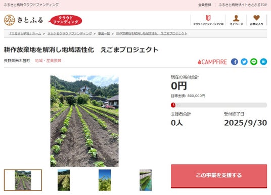 長野県南木曽町とふるさと納税ポータルサイト「さとふる」を運営する株式会社さとふる(本社:東京都中央区、代表取締役社長 兼 CEO:藤井 宏明)は、「さとふるクラウドファンディング」にて、「耕作放棄地を解消し地域活性化 えごまプロジェクト」の寄付受け付けを2025年4月1日より開始します。