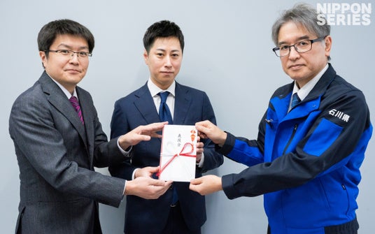 石川県庁にて義援金の贈呈を行う NIPPON SERIES エグゼクティブディレクター・木原直哉(左)、オーガナイザー・じぇいそる(中央・矢倉高士)、石川県出納室長・中村一弥氏(右)