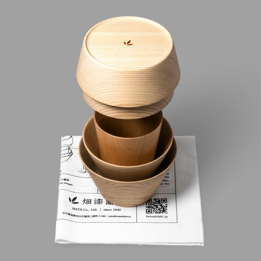 dish、bowl、cupの異なる用途の器が巧みに重なり、手ぬぐいに包んで持ち運べる。山中漆器の老舗・畑漆器店が手がけた、3種のスタッキング可能な木製組み食器が誕生しました。