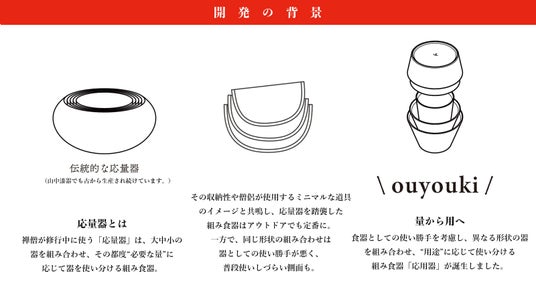 畑漆器店では、伝統的な禅僧の食器「応量器」から着想を得て、現代の生活に寄り添う新たな器の開発に取り組みました。「応量器」は、僧侶が修行中に使う大中小の器を組み合わせた食器で、必要な量に応じて使い分ける合理的な道具です。アウトドアシーンでもその収納性が評価され定番となる一方、同形状の器を重ねる設計では使い勝手に課題がありました。