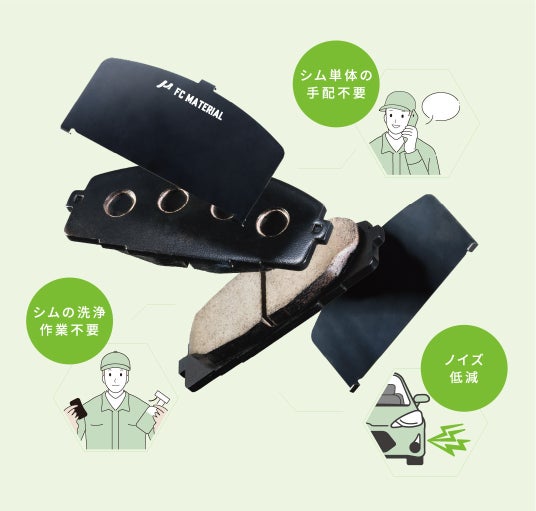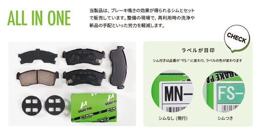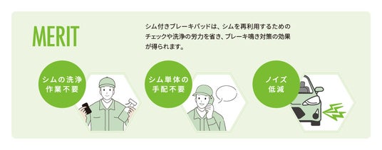 この製品は、ブレーキ鳴きを抑えるシムとブレーキパッドをセットで提供する製品です。これにより、整備現場でシムの洗浄や新品手配といった時間を短縮でき、より効率的な整備作業が行えます。