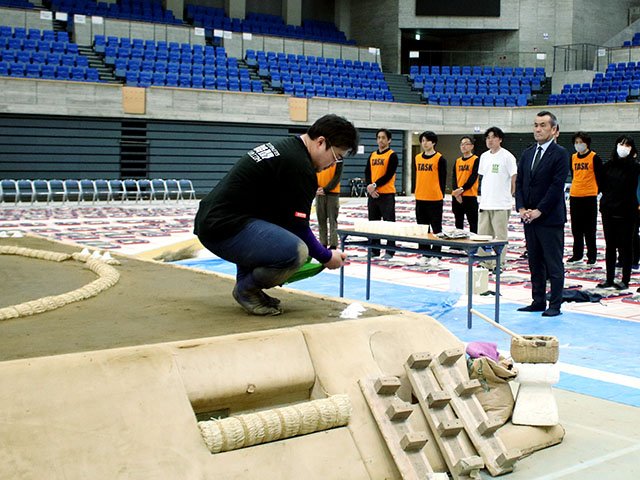 日本相撲協会の呼び出しが土俵を整え、スタッフが観客席に座布団を並べたり、朝乃山ら力士のしこ名を染め抜いたのぼり旗を会場周辺に立てたりした。土俵祭りには約40人が出席し、呼び出しが土俵の俵上や四隅に置かれた盛り塩に酒をかけて清めた。
