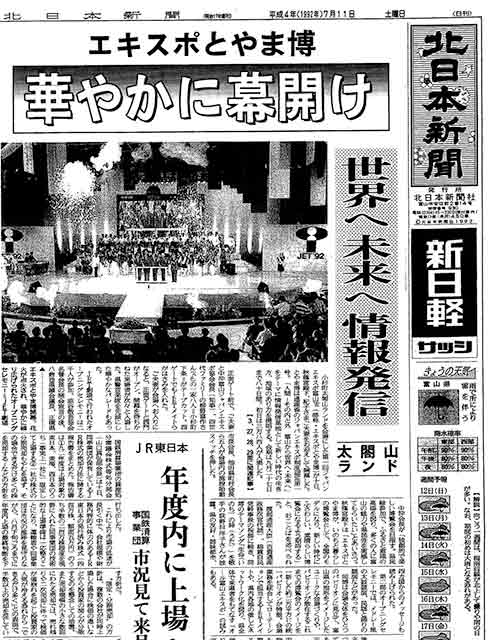 ジャパンエキスポ富山の開幕を伝える1992年7月11日の北日本新聞朝刊1面