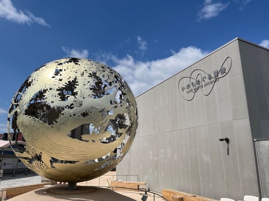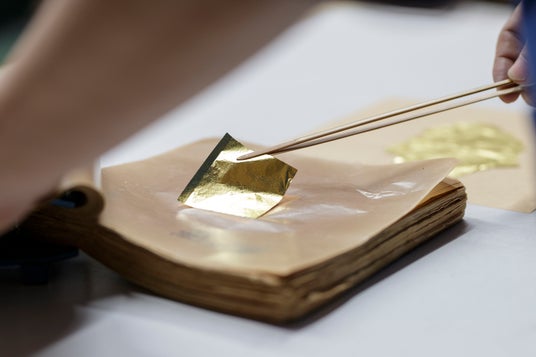 本パビリオンのシンボルとなる「いのち球」のオブジェには、リサイクル金属の回収・再資源化を行 うミナミ金属株式会社(本社:石川県金沢市、代表取締役社長:岡村 淳)が再生した金属を使用。当社は、そのリサイクル由来の金を用いて製造した金箔を施し、装飾を担当いたしました。