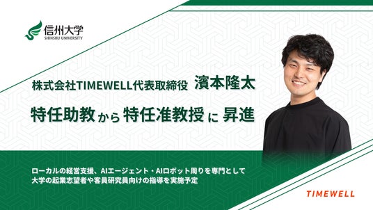 株式会社TIMEWELL(本社:神奈川県横浜市、代表取締役:濱本隆太、以下「TIMEWELL」)は、代表取締役 濱本隆太が信州大学特任助教から特任准教授に昇進したことをお知らせします。