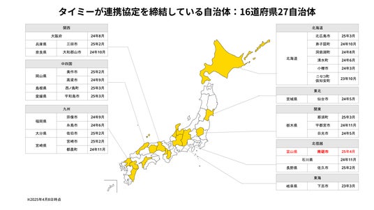 当社はこれまで15道府県・26自治体と連携協定を締結しており、今回の南砺市との連携協定は16道府県・27自治体目となります(※2)。富山県内の自治体との連携は今回が初めてとなります。