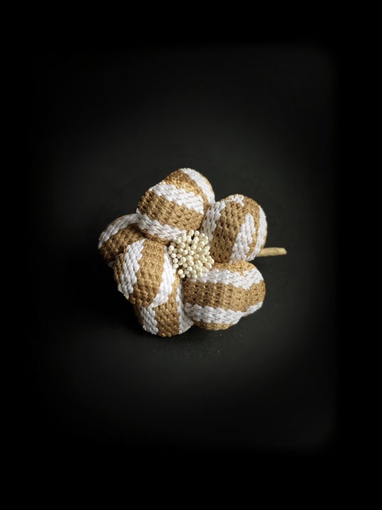 岡山県産の細巾織物を使用した、ベージュと白のストライプリーフのコサージュ。