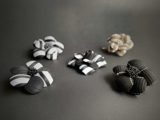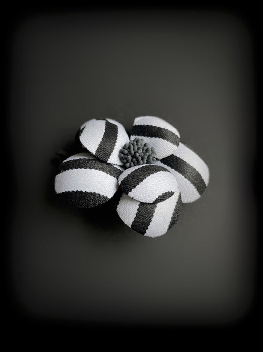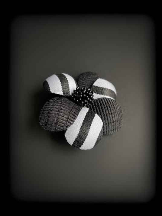 石川県産のゴム生地のみを使用した、黒と白にストライプリーフのコサージュ。