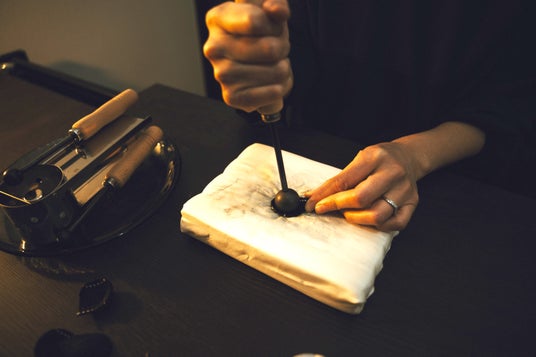 熱した先が丸いコテを生地にあて一枚ずつ花びらを制作している工程