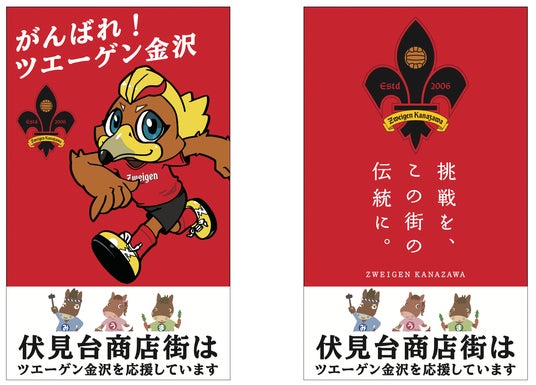 この度、ツエーゲン金沢(J3)は、石川県金沢市に位置する伏見台商店街の活性化、そして地域に愛されるクラブになるために、地域の皆さまと共に盛り上げ、元気なまちづくりに貢献することを目的に、ツエーゲン金沢と伏見台商店街がコラボしたデザインのタペストリーを設置いただきました。