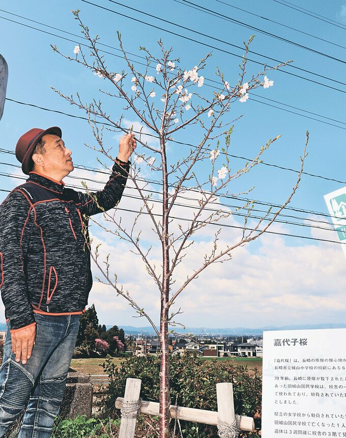 嘉代子桜は、動員先の兵器工場があった長崎市の旧城山国民学校(現城山小学校)で原爆被害に遭い、15歳で命を落とした林嘉代子さんにちなんで名付けられた。戦後、嘉代子さんの母が、娘が好きだったソメイヨシノの苗木50本を同校に寄贈。現在も校庭に6本が残り、地域住民が大切に育てる。同校の原爆殉難者慰霊会は平和の尊さを広めようと、接ぎ木して育てた苗木を全国各地に寄贈している。