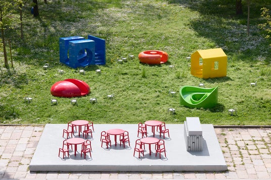 海外初展示となる今回は、これまでに発表したプロジェクトのなかから、国際的な安全性や機能の有効性を示すTUV認証を取得したものを中心にセレクト。ミラノ市内中心部にあるセンピオーネ公園のなかにある、トリエンナーレ・ミラノの玄関前広場を舞台に「Playful Sculptures」と題したインスタレーションを展開しました。