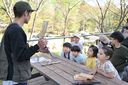 自然のことがわかると、外遊びが楽しくなる! キャンプ場周辺地域の動物についてクイズ形式で学びながら、木を切って自分だけのオリジナルバードコールを作ります!