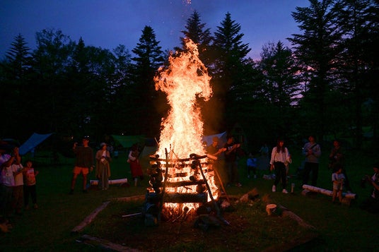 星空の下、標高1,250mのキャンプ場で高原の澄んだ空気を感じながらキャンプファイヤーを囲みませんか? 子どもから大人まで炎を眺め、GWに特別な思い出作りを。