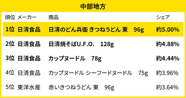 富山県を含む中部地方のランキングを見ると1位は「日清のどん兵衛きつねうどん東」。ここで不思議に感じたのが「東」の一文字。発表資料をよく見ると、中国地方や四国地方のランキングに入っているのは「日清のどん兵衛きつねうどん西」だった。