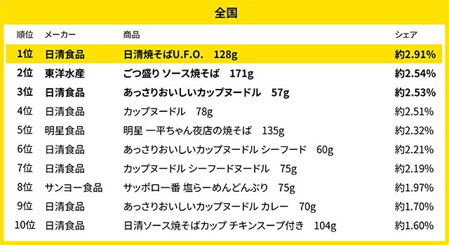 ランキングは東芝データが公表した「地方別のカップ麺売れ筋ランキング(2025年2月)」。東芝グループの電子レシートサービス「スマートレシート」の利用者のデータを基に、さまざまな商品の買い物動向をまとめている。2月は「カップ麺」がテーマで、全国ランキングでは焼きそば「日清焼そばU.F.O.」が1位だった。