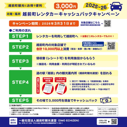 福井県越前町の一般社団法人越前町観光連盟(DMO ECHIZEN)では、2次交通の弱い福井県と越前町における移動手段の手助けとするため、レンタカー料金の一部を支援するキャンペーンを実施し、レンタカーの活用を促進しています。