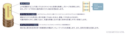 AC+シリーズは、高いAC(アルカリキャンセル)効果があり、髪のダメージを抑制します。さらに「アミノセラミド成分」がCMC-β層をケアし毛髪内部を保護、「デュアルフィット成分」でキューティクルを保護することで髪の体力を維持します。また、染料の定着を促進する効果も期待できます。