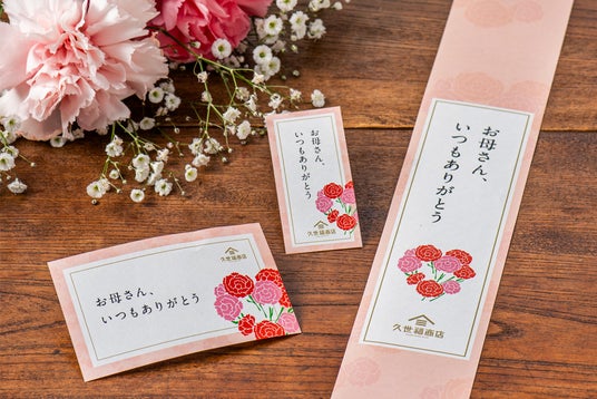 「うまいもので感謝を伝える 母の日」フェア期間中は、カーネーションをモチーフにしたかわいいカードやシール、帯のしをご用意!こちらは無料でご利用いただけます。