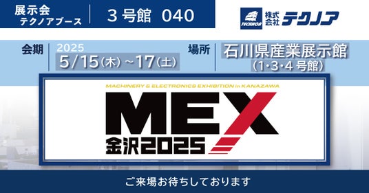 株式会社テクノア(本社:岐阜県岐阜市、代表取締役:山崎 耕治)は、5/15~17 に石川県産業展示館(1・3・4号館)で開催される「MEX金沢2025(第61回機械工業見本市金沢)」に出展いたします。