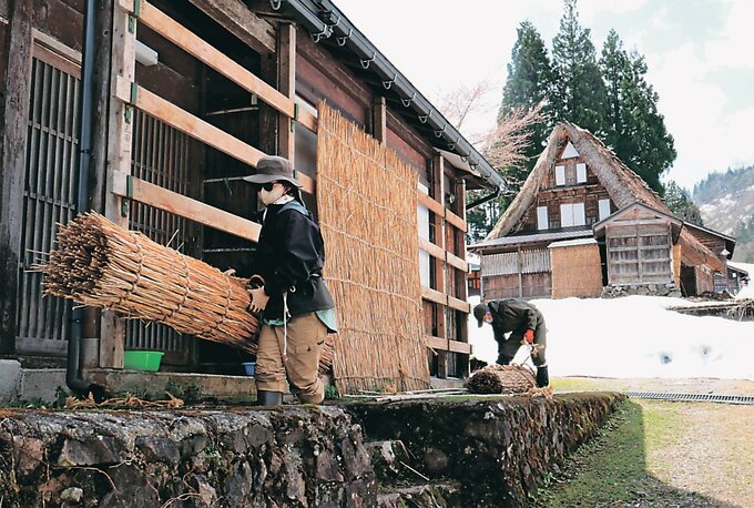 富山県南砺市平地域の世界遺産、相倉合掌造り集落で14日、冬の風雪から家屋を守ってきた昔ながらの雪囲い「オオダレ」を外す作業が始まった。今冬の大雪の影響で雪が多く残ったため、昨年より1週間遅い開始となった。