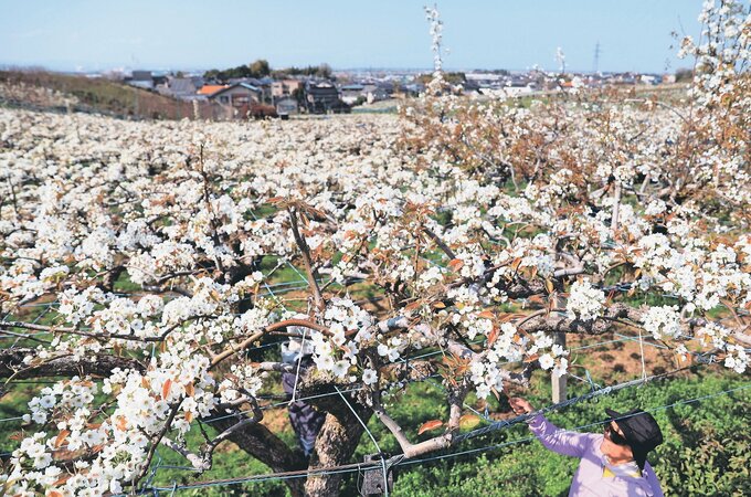 呉羽ナシの産地として知られる富山市の呉羽丘陵でナシの花が咲き始め、畑一面を白いじゅうたんのように覆っている。14日は好天に恵まれ、農家が人工授粉の作業に励んだ。