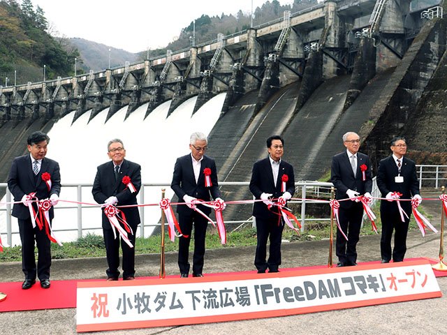 広場のオープニングセレモニーには、関電や地元の関係者30人が出席した。関電庄川水力センターの田村友一所長が「多くの人に壮大な歴史を持つ小牧ダムを見てもらいたい」とあいさつ。市観光協会の五島辰夫会長が「砺波の大きなブランドになれば幸い」と述べ、テープカットした。