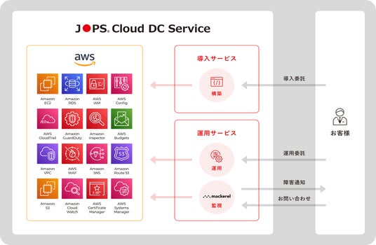 JOPSには、設計・運用・セキュリティなど様々な分野のAWS認定資格を有したエンジニアが多数在籍しています。そのため、提案から運用まで全ての工程において豊富な専門知識に基づいた高品質なサービスを提供することが可能です。当社では、AWSおよびサーバー導入支援を行う「導入サービス」や、メンテナンスや設定変更、システム監視、障害対応などを行う「運用サービス」、クラウドの性能を最大限に活かしたCloud Nativeなシステム開発を「JOPS Cloud DC Service」として以下の図のように展開し、お客様のニーズに基づいたワンストップのサービスを通じて、企業の最適なクラウド環境の実現を支援します。