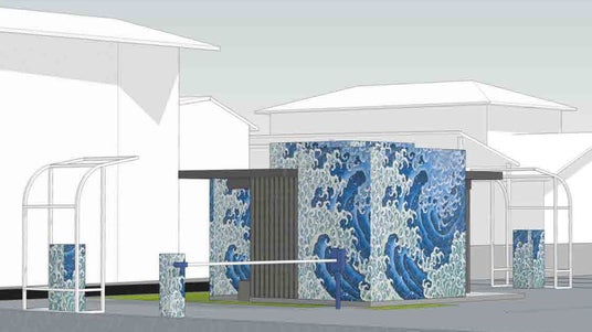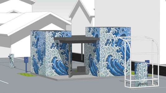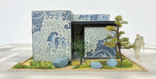 葛飾北斎 「上町祭屋台天井絵 怒濤図男浪」 でラッピングされた北斎館東町駐車場トイレ 完成予想模型 (スタジオテラ)