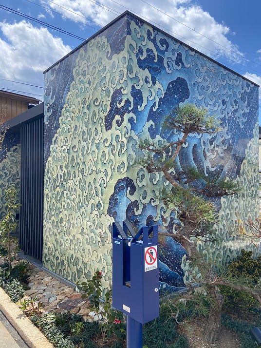 小布施の北斎を象徴する「怒濤図 男浪」が、駐車場のトイレ・ゲートを彩ります。晩年の北斎が訪れて傑作を残した小布施ならではのゲートが完成しました。2025年4月24日のテープカットとともにお披露目です!
