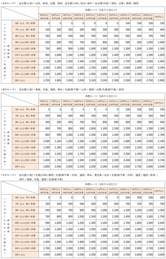 なお、燃油特別付加運賃は、シンガポールケロシン市況価格および為替レートの変動に応じて、 1ヶ月毎に見直しております。