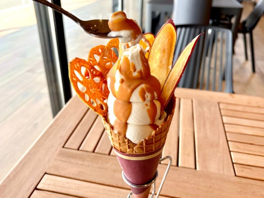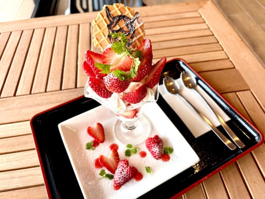 道の駅内の食堂にて、季節限定「いちごパフェ」や「ごぼうと芋チップ×キャラメルソフト」が登場!