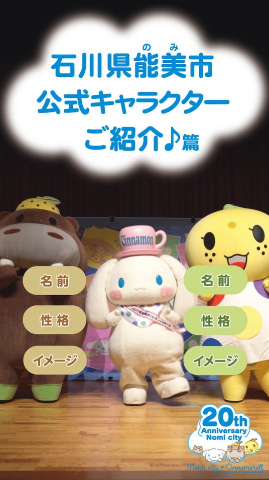 エントリーにあたり、能美市公式キャラクターの魅力を知ってもらうために、ショート動画を能美市公式YouTubeチャンネルで順次、公開します。能美市応援大使「シナモロール」も登場するかわいい動画に仕上がっていますので、お楽しみに♪- 公開予定日時