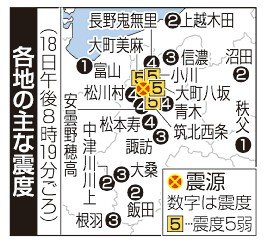 震度5弱を観測したのは、長野県大町市、筑北村、小川村。長野市や松本市では震度4を観測した。消防によると、同県山形村の男性(16)が避難中に転倒し病院に搬送された。軽傷とみられる。