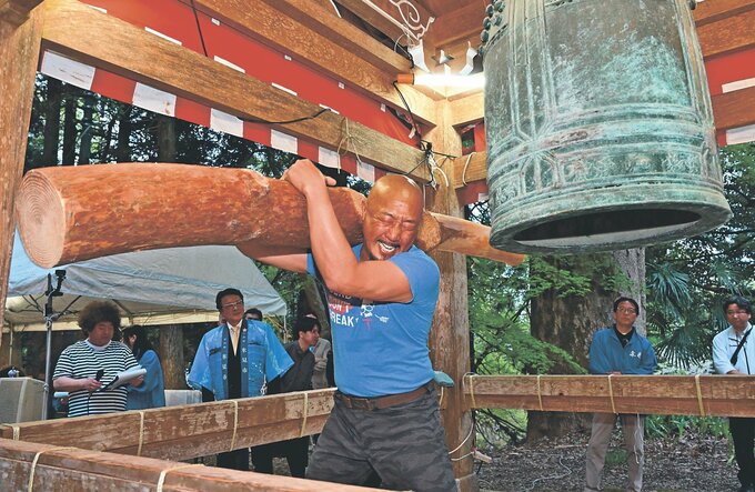 能登の被災地に通う災害ボランティア、中国の留学生、ハンドボール・リーグH男子の富山ドリームスの選手ら多彩な顔ぶれが順に登場し、歯を食いしばりながら肩に担いだ丸太を振って鐘を打った。見物人からは「頑張れ」と盛んに声援が飛んだ。