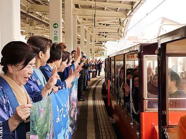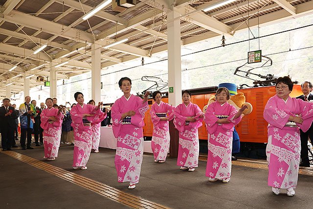 宇奈月駅のホームでセレモニーがあり、地元の有志でつくる「桃の会」が「宇奈月温泉小唄」を披露。黒部峡谷鉄道の鈴木俊茂社長が「欅平までの全線開通ができず心苦しいが、見どころはたくさんある」とあいさつし、武隈義一黒部市長と川端康夫黒部・宇奈月温泉観光局代表理事が「たくさんの人に楽しんでほしい」と述べた。