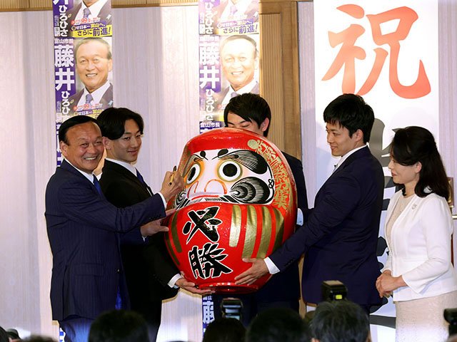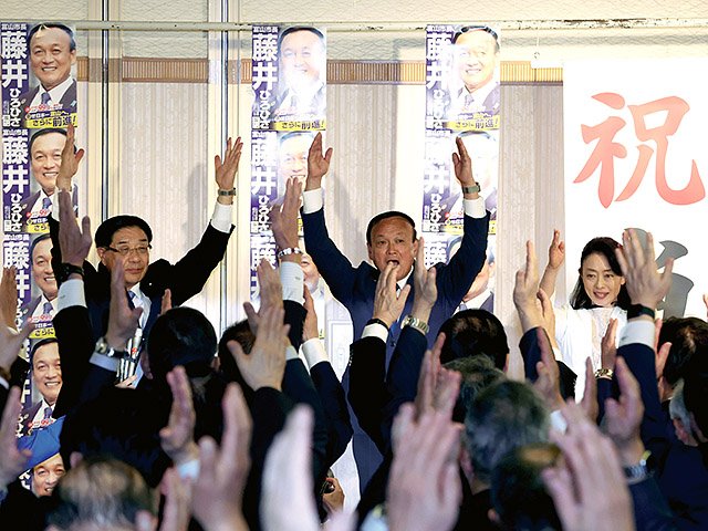 富山市桜橋通りのホテルグランテラス富山の特設会場では、午後7時すぎから藤井氏の支持者が訪れ始めた。同8時に「当選確実」の一報が入ると、「おおっ」という歓声や大きな拍手が起きた。直後、妻の薫さん(58)と共に姿を見せた藤井氏は、支持者に頭を下げて謝意を伝えながら、にこやかな表情でステージに上がった。