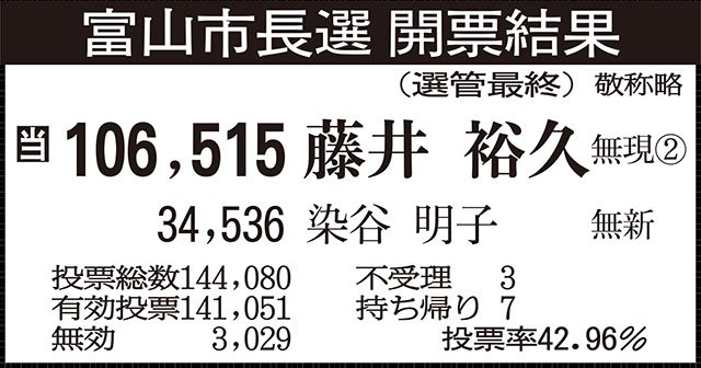 任期満了に伴う富山市長選は20日投開票され、現職の藤井裕久氏(63)=無所属、婦中町千里=が10万6515票を獲得し、新人で団体職員の染谷明子氏(47)=無所属、中島=を大差で破り、再選を果たした。任期は24日から4年間。