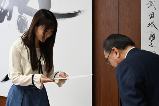 あわら市長より、笑顔で委託状を受け取るもりゆかさん。