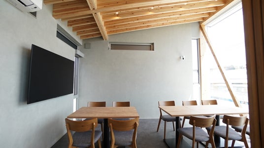 打ち合わせやプレゼンテーションに最適な落ち着いた雰囲気の最大10名で利用可能な会議室。自然光と木の質感が調和した空間で、クリエイティブな議論が生まれやすい環境を提供します。