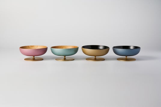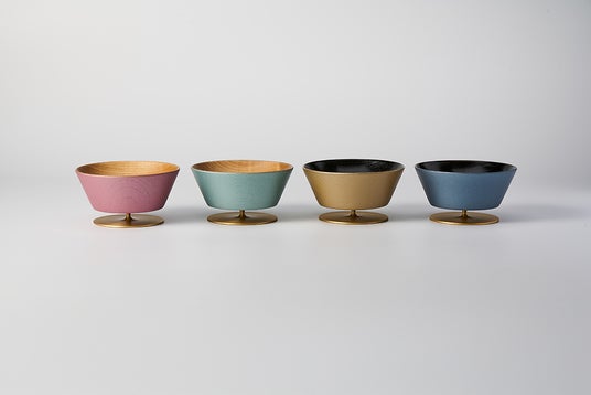 熱伝導率の低い木がアイスの冷たさを保ち、高岡銅器の技術で仕上げた真鍮のステム部が高級感と安定性を演出。山中漆器の伝統技術と異素材の融合により、食後の時間を贅沢に彩る器が誕生しました。