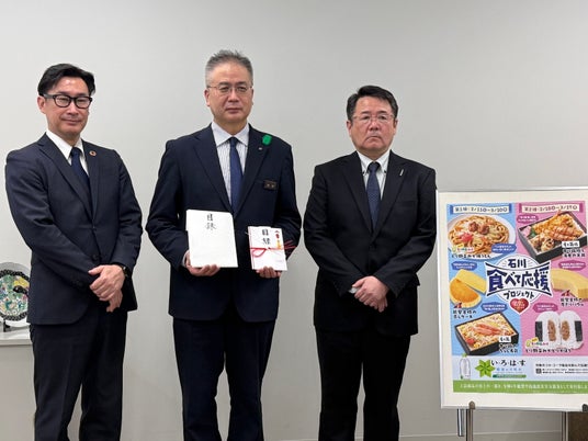株式会社ファミリーマート(本社:東京都港区、代表取締役社長:細見研介)は、継続して取り組んでいる令和6年能登半島地震災害の影響による石川県の復興支援の一環として、石川県のメーカー食材を使用した商品や、能登金時を使用した美味しい商品を集めたフェア「石川食べて応援プロジェクト」を2025年2月11日(火)から3月17日(月)までの期間、北陸地方のファミリーマート約520店にて実施いたしました。今回、その売上の一部を以下の通り寄託いたします。併せて、コカ・コーラカスタマーマーケティング株式会社(本社:東京都港区、代表取締役社長:荷堂 真紀)および 地域ボトラーを代表して、北陸コカ・コーラボトリング株式会社(本社:富山県高岡市、代表取締役社長執行役員:井辻 秀剛)も対象商品の売上の一部を寄託いたしました。