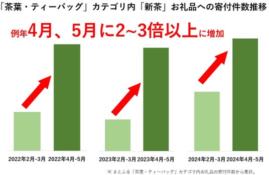 「さとふる」の「茶葉・ティーバッグ」カテゴリにおいて、2024年12月の寄付件数は前年同月比で約1.4倍に増加しました。さらに、2022年から2024年にかけて、同カテゴリ内の「新茶」とつくお礼品の4月、5月の寄付件数は、いずれの年も2月、3月と比較して2~3倍以上に増加しました。新茶のシーズンに合わせ、ふるさと納税を活用して全国各地の銘茶を手に入れようとする動きがみられました。