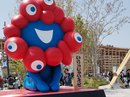 お目当てのパピリオンのシンボルを見上げ、興奮気味の記者と息子(手前)
