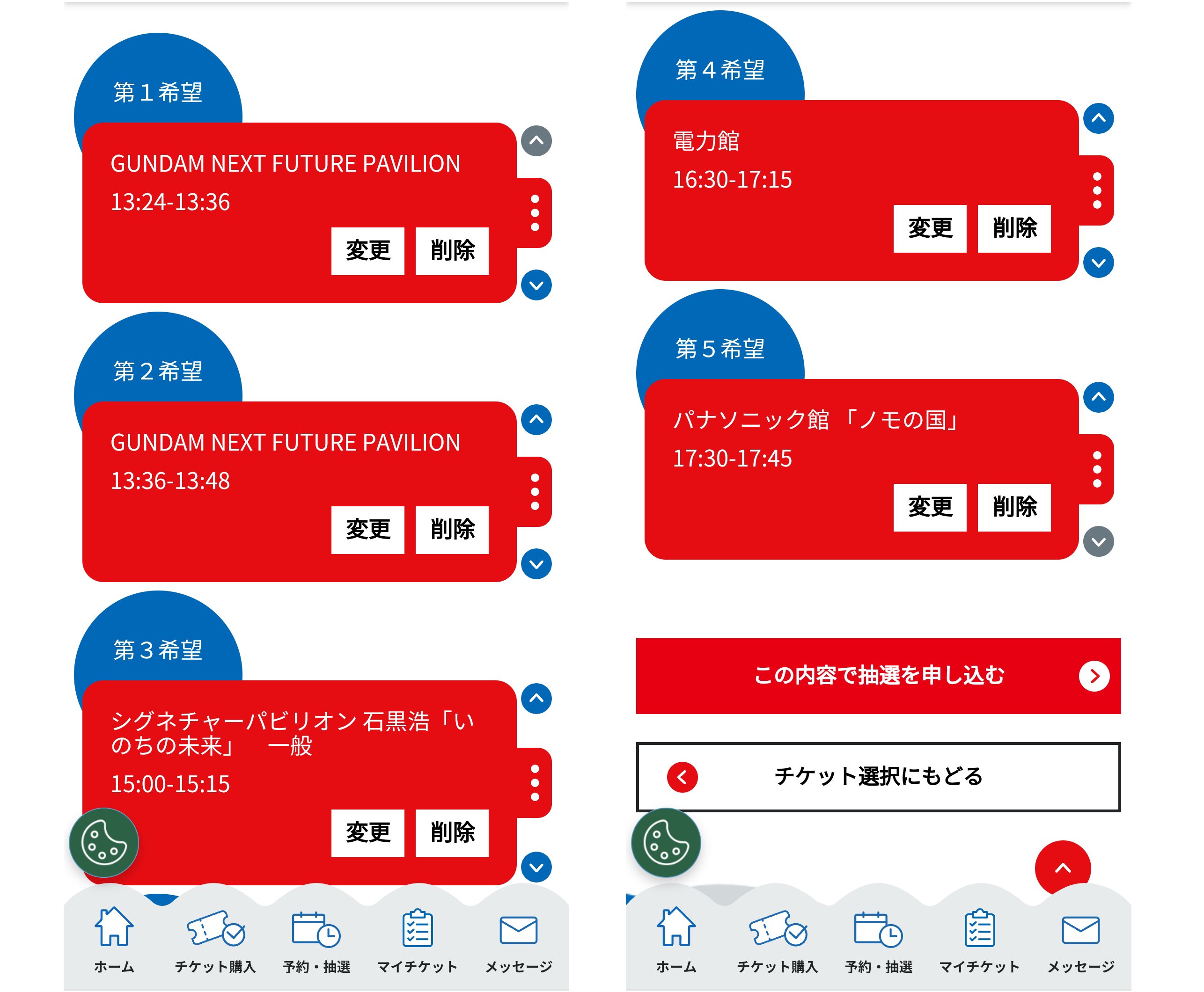 次の難関は、パビリオンの予約だ。行くことを直前に決めたため「2カ月前抽選」は参加できず、残るチャンスは「7日前抽選」と「空き枠先着(3日前の午前0時から前日午前9時まで)」。「7日前抽選」では、第5希望まで予約制の企業パビリオンや海外パビリオンの空いている時間の枠を指定できる(当選するとは限らない)のだが、選択後に「申し込む」をクリックするのを忘れてしまった…。